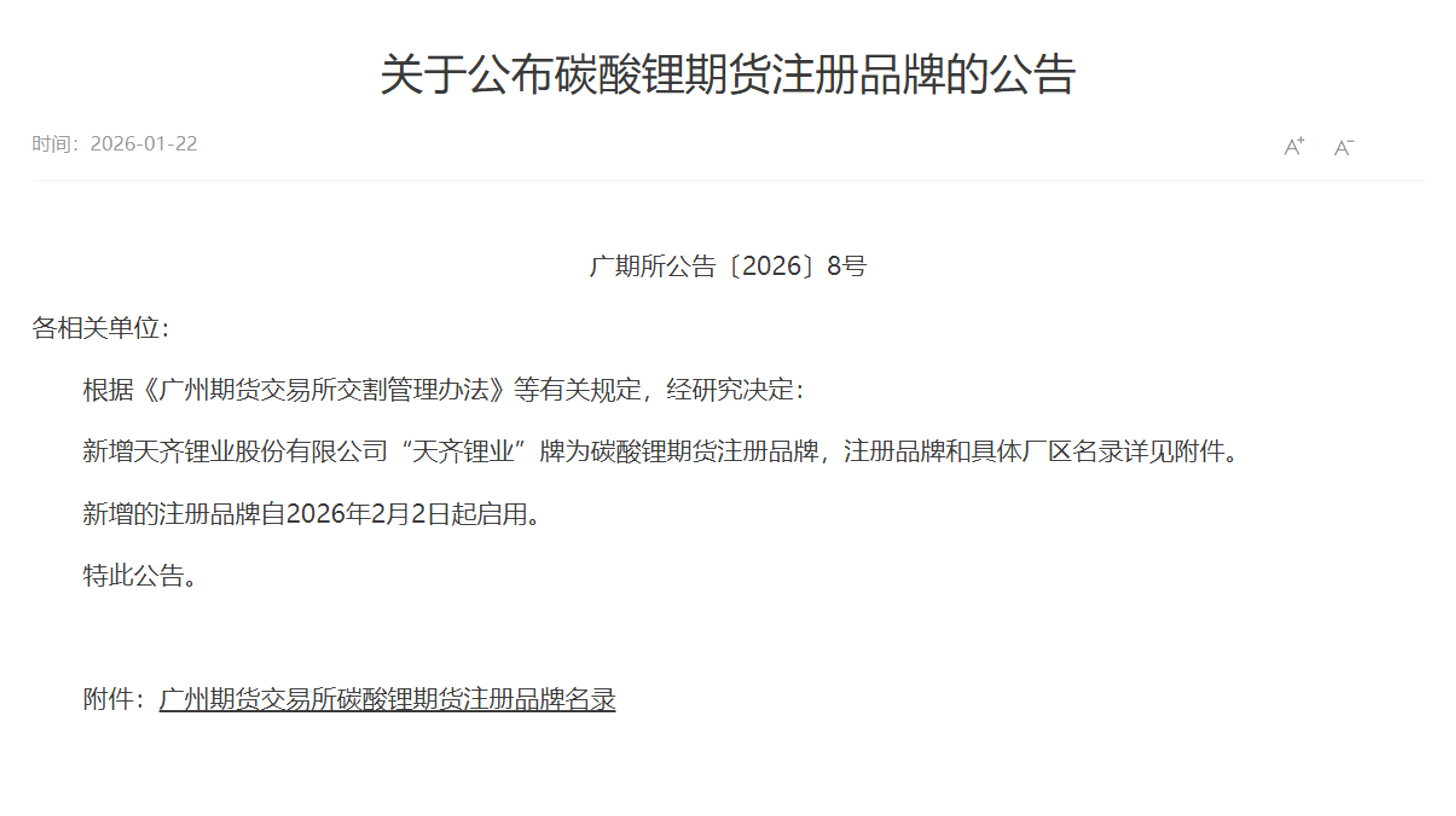 On January 22, Tianqi Lithium Corporation’s “Tianqi Lithium” branded lithium carbonate was officially approved for inclusion in the registered brand list for lithium carbonate futures on the Guangzhou Futures Exchange, becoming the first registered brand for this product. According to Announcement [2026] No. 8 issued by the exchange, the brand designation will officially